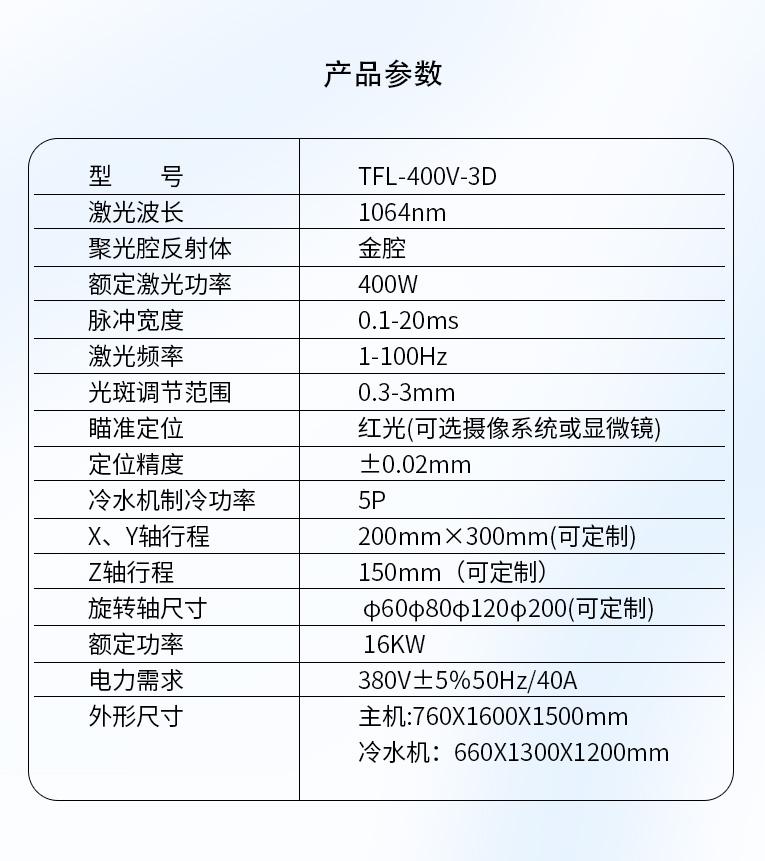1、TFL-400V/500V-3D,由雙路氙燈泵浦、進口陶瓷反射腔體及Nd:YAG晶體棒構(gòu)成激光器,電光轉(zhuǎn)換效率高。