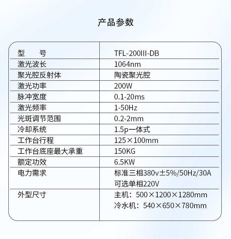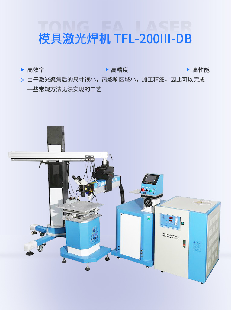 TFL-200Ⅲ-DB型模具激光焊機是通發(fā)激光公司在TFL-180Ⅲ的基礎(chǔ)進行了改良,采用通發(fā)自主研發(fā)的二代精密單燈電源為燈泵浦驅(qū)動電源,操作更方便。主機具備激光頭手搖升降與工作臺按鈕電動升降實現(xiàn)焊接不同厚度模具的激光焊加工。本款機型更適用于各類高精密注塑模具激光補焊,精密塑膠模具零件激光修補,塑膠模具鈹銅零件激光燒焊;可對模具使用過程中出現(xiàn)的磨損進行激光修復(fù);對機械加工失誤、電火花加工失誤,模具減膠設(shè)計變更等需要對模具修改,起到關(guān)鍵的作用,可彌補應(yīng)加工失誤造成的巨大損失。
