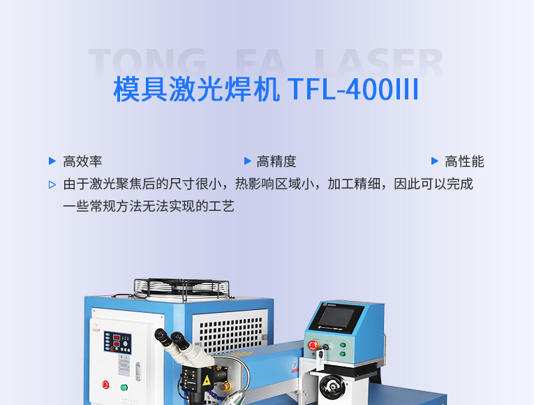通發(fā)激光TFL-400Ⅲ大功率模具激光焊機(jī),比普通激光焊機(jī)修復(fù)模具效率快1.5-2倍,適合0.3-0.6激光焊絲,大功率更適合修復(fù)鈹銅模具、鋁模等較難修復(fù)的模具。