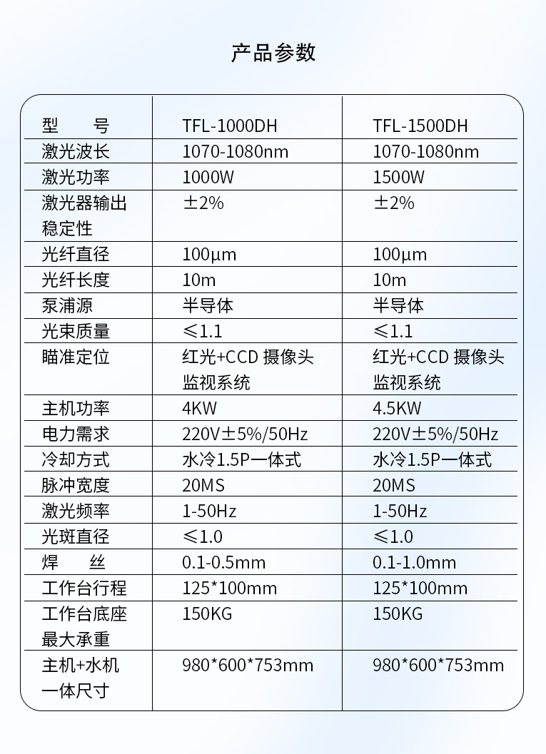 采用光纖激光器,反射率高,能量強,免維護,免調(diào)光,功耗少,相比傳統(tǒng) 模具焊來說,體積小,安全,穩(wěn)定性好超長使用壽命。 1000W光纖激光器,滿足銅、鋁焊接量大的模具及產(chǎn)品焊接加工需要。 高承重底座及工作臺,保持輕便靈活的優(yōu)點,同時提供更高承載能力。 配備.1.5P大功率一體式水冷水機,保證了大功率焊接的穩(wěn)定性。